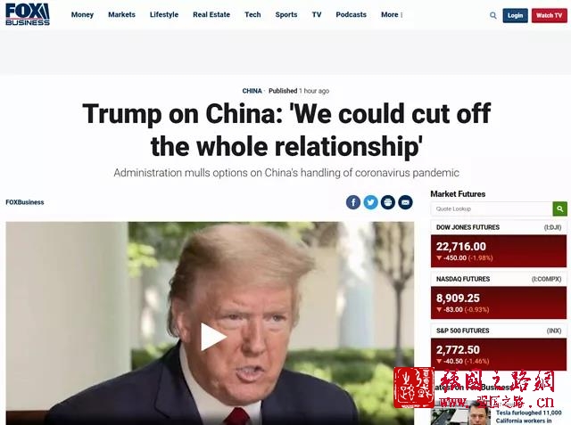 特朗普总统星期四接受福克斯新闻采访时声称,美国可能切断整个美中关系,这样美国可以节省5000亿美元。这话非常轰动,但是如果人们记得,就是这位总统不久前在记者会上建议新冠肺炎患者注射消毒剂来杀死身体里的病毒,再听他这样说,大概就不会吃惊了。