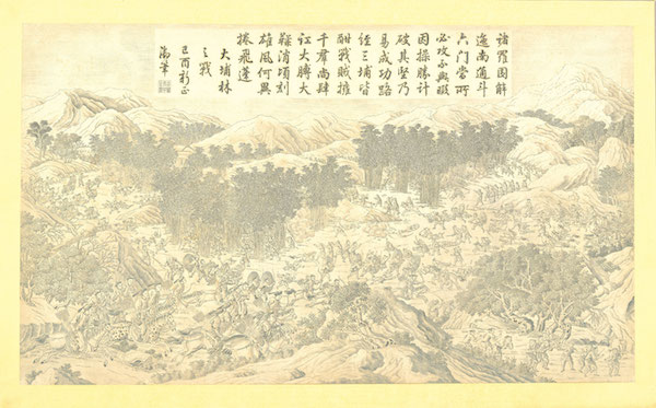 铜版画源自欧洲,最早由匠师使用雕刻刀直接于金属器物上镂刻图案,后逐渐发展出凹版艺术的铜版画。清代康雍乾三朝皆曾用兵西北,并于乾隆二十五年(1760)终获底定,为表彰此一功业,乾隆皇帝下令来华传教士绘制西征回疆战图,后分批送至法国制作铜版画,至乾隆三十八(1773)告竣,即清廷制作的第一套铜版画—《平定回疆图》,尔后则转由中国宫廷匠师继续制作各式铜板战图。林爽文事件结束后,为彰战功,乾隆皇帝再著令宫廷画师缪炳泰、姚文瀚、谢遂……等七人绘制彩图,并制作一系列铜板图,共计十二幅。画中揉合中国传统画及西洋绘画技巧,以全景式构图诉说主题战况,并搭配有木版刷印乾隆皇帝御题诗,图文呼应。本次选展其中六幅,以呈现这场事件的部分风貌。