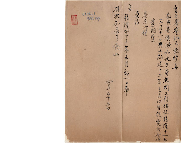 清代迁都北京,将盛京定为陪都,其皇家重要档案与官书典籍,定制两京皆须典藏,以示对关外祖宗的尊重与敬仰。乾隆十三年(1748)盛京建成崇谟、敬典等阁,作为贮存档案之地。其中记录皇族的《玉牒》,在敬典阁建成后即已放置贮存;惟五朝《圣训》与《实录》原置放于凤凰阁内,乾隆四十三年(1778)四月,清高宗认为贮于凤凰阁与体制不合,遂下令改移于崇谟阁。本奏摺即盛京将军弘晌遵旨查勘敬典、崇谟、凤凰等阁贮置官书情形,并将各处放置收贮典籍之金匮数量,分别绘图进呈御览。