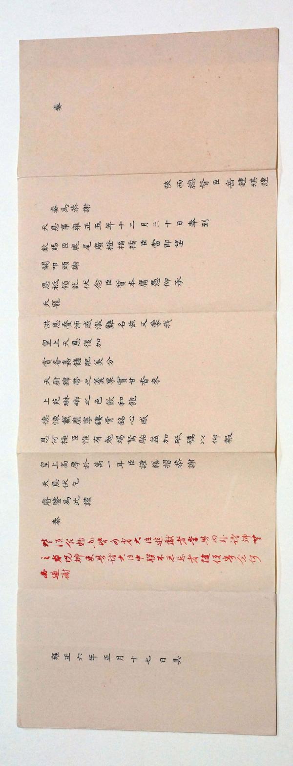 奏折是清代官员向皇帝报告地方事务,或请安谢恩的一种文书。奏摺制度推行于康熙时期,确立于雍正年间,乾隆朝以后成为定制,作为官员与皇帝间沟通的重要媒介。奏摺内容涵盖地方政务、军事战争、民情风俗、农业经济、治安教育,以及皇室内政、人事任免,是后世了解清代重大事件的主要文献材料。台北故宫博物院保存大量清代奏折文书,其上可见历朝君主对臣工进呈事务的朱笔批示,不仅反映皇帝的个性与施政风格,亦呈现君主个人的书法特色。