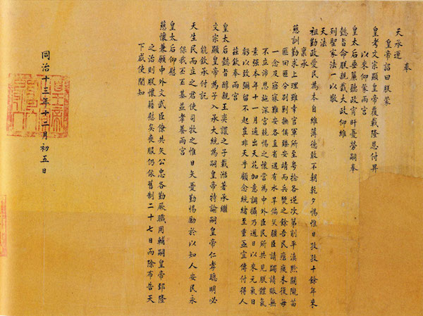 诏书是皇帝于国家举办隆重庆典或遭逢重大事件时,亲向天下臣民颁布的一种文书。举凡皇帝登基、亲政、大婚、驾崩、罪己、退位、皇太后上徽号等,或皇帝认为有必要让天下知晓的事务,皆透过诏书周知天下臣民。清代诏书以满汉文字书写,并以“奉天承运皇帝,诏曰”起首,中间叙述颁诏内容,文末则为“布告天下,咸使闻之”等语。诏书由内阁官员起草,经内阁大学士审定,再进呈皇帝钦准后制作。每份诏书内容互异,然皆透露一件大事。观众透过本单元选件,可从中知悉有清一代各种趣味故事。