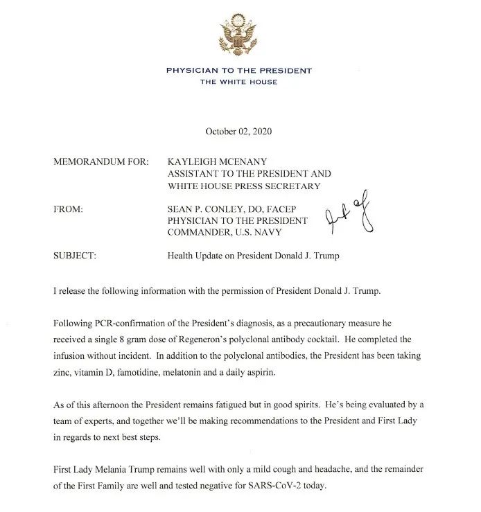 特朗普医生给他的治疗方案是:8克Regeneron多克隆抗体混合物,锌,维生素D,褪黑素,阿司匹林。