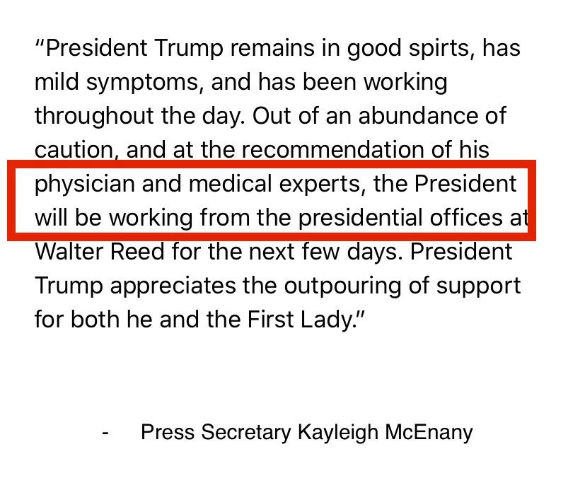 但是白宫却在一份声明中试图淡化特朗普的病情,强调特朗普不是去住院,而是“工作”。在医生的建议下,采取谨慎措施,特朗普将在医院里的总统办公室办公。特朗普今天也一直都在工作。