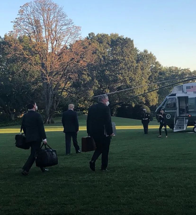 特朗普在2号下午6点从白宫出发。随行的工作人员换上了N95口罩。