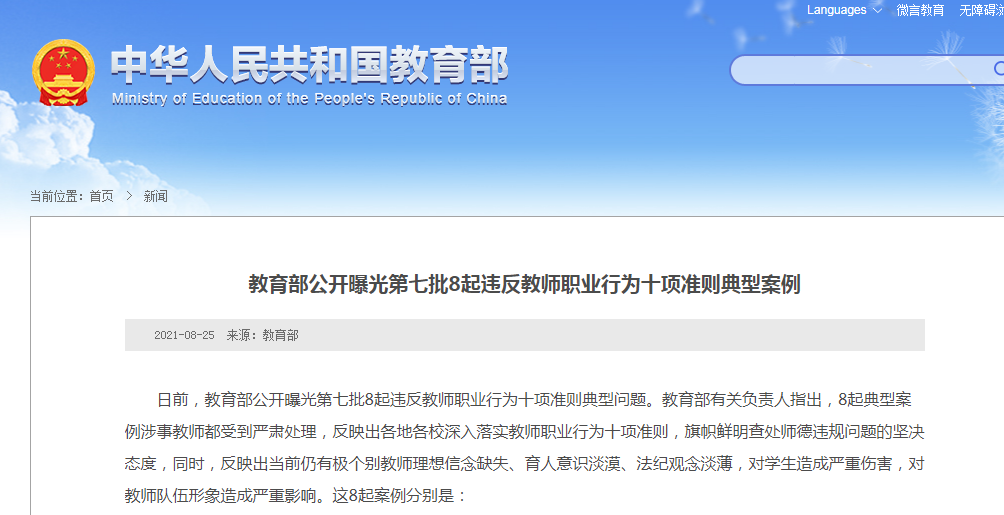 日前,教育部公开曝光第七批8起违反教师职业行为十项准则典型问题。教育部有关负责人指出,8起典型案例涉事教师都受到严肃处理,反映出各地各校深入落实教师职业行为十项准则,旗帜鲜明查处师德违规问题的坚决态度,同时,反映出当前仍有极个别教师理想信念缺失、育人意识淡漠、法纪观念淡薄,对学生造成严重伤害,对教师队伍形象造成严重影响。