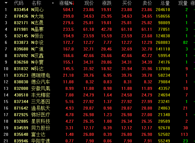 11月15日北交所正式开市交易,市场交易活跃,今天挂牌上市的10只新股中,N同心大涨504.1%,N大地、N志晟、N晶赛涨超200%,N恒合、N中设、N广道、N汉鑫、N中寰、N科达等涨超100%。