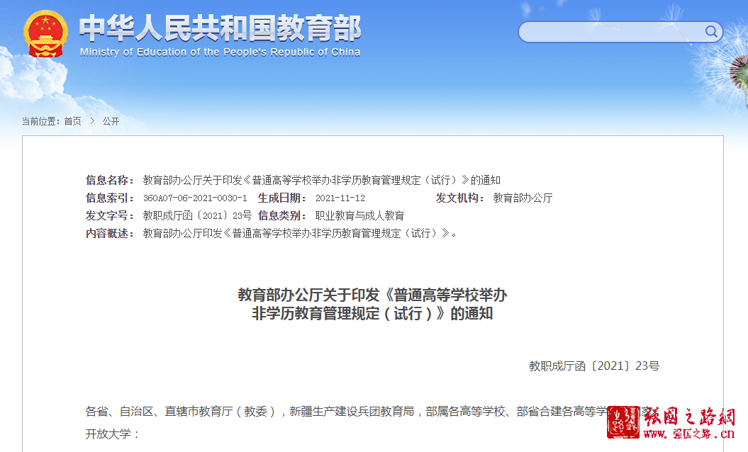 在监督管理方面,《规定》要求高校建立覆盖非学历教育立项、研发、招生、收费、教学、评价、发证等各环节的质量管理体系,实现办学过程受监控、可追溯。高校非学历教育办学情况纳入继续教育发展年度报告工作,主动向社会公开。