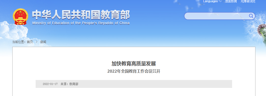 1月16日至17日,2022年全国教育工作会议在北京召开。会议强调,要以习近平新时代中国特色社会主义思想为指导,深入学习贯彻党的十九大和十九届历次全会精神,认真贯彻落实习近平总书记关于教育的重要论述,增强“四个意识”、坚定“四个自信”、做到“两个维护”,弘扬伟大建党精神,深刻认识“两个确立”的决定性意义,坚持稳中求进工作总基调,全面贯彻新发展理念,服务构建新发展格局,坚持和加强党对教育工作的全面领导,全面贯彻党的教育方针,落实立德树人根本任务,着力转变观念、守正创新、攻坚克难、守住底线,加快教育高质量发展,推进教育现代化、建设教育强国、办好人民满意的教育,培养德智体美劳全面发展的社会主义建设者和接班人,以实际行动和优异成绩迎接党的二十大胜利召开。中央教育工作领导小组秘书组组长、教育部党组书记、部长怀进鹏作工作报告。