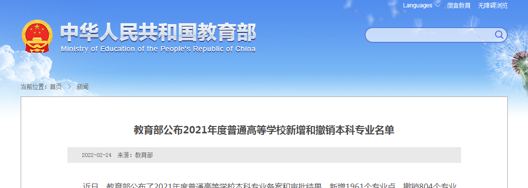 据教育部网站消息,近日,教育部公布了2021年度普通高等学校本科专业备案和审批结果,新增1961个专业点、撤销804个专业点,31种新专业列入《普通高等学校本科专业目录》。