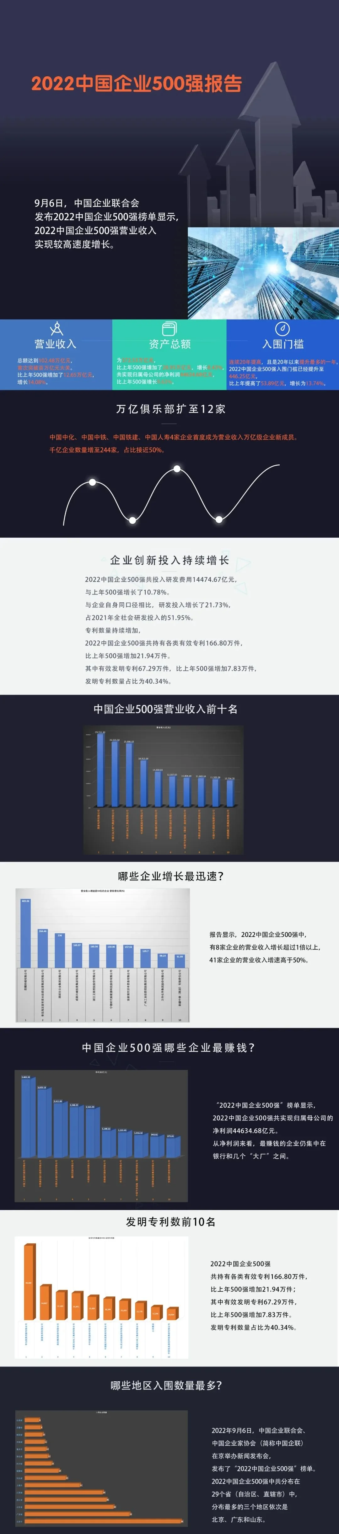 9月6日,中国企业联合会发布2022中国企业500强榜单显示。2022中国企业500强营业收入实现较高速度增长。