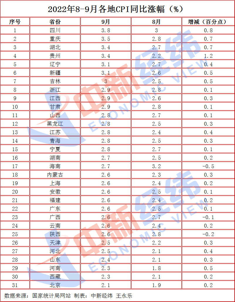 中新经纬10月18日报道,日前,国家统计局公布了31省份2022年9月居民消费价格指数(CPI)。中新经纬梳理发现,9月,28省份CPI同比涨幅高于上月。其中,四川最高为涨3.8%,北京最低涨2.1%。