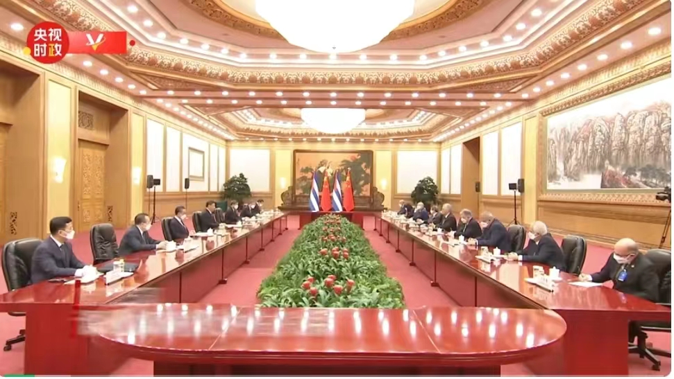 习近平指出,你是中共二十大后首位访华的拉美和加勒比国家元首,充分体现了中古两党两国的特殊友好关系。古巴是西半球第一个同新中国建立外交关系的国家,中古关系成为社会主义国家团结合作、发展中国家真诚互助的典范。中方愿同古方不断深化政治互信,拓展务实合作,在涉及彼此核心利益问题上坚定相互支持,在国际和地区事务中加强协调配合,在建设本国特色社会主义道路上携手并进,不断深化新时代中古关系。
