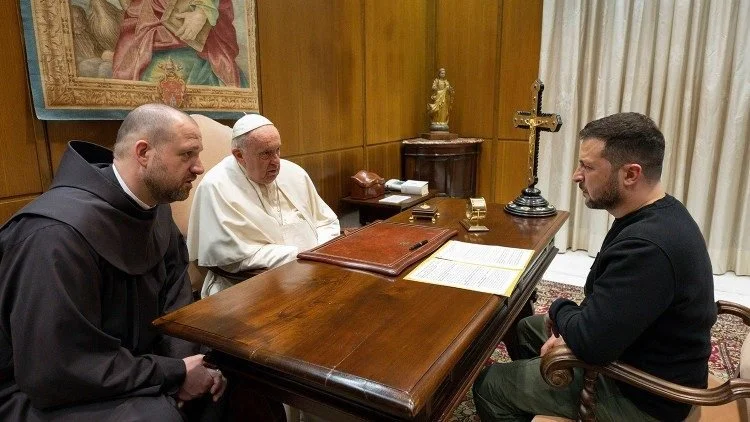 方济各在25日的年度圣诞致辞中呼吁结束战争与冲突,包括持续近两年的俄乌冲突。他任命的俄乌冲突特使意大利红衣主教马泰奥·祖皮(Matteo Zuppi)已访问乌克兰、俄罗斯、美国和中国等国。泽连斯基感谢了教皇在其致辞中为乌克兰送来和平的祈福,也感谢他对乌方努力的支持。