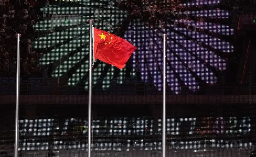 这是开幕式现场拍摄的中华人民共和国国旗。新华社记者 黄伟 摄