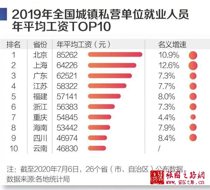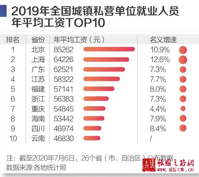 城镇非私营单位方面,全国仅有北京、上海、天津、浙江、广东、江苏等6省市的年均工资超过90501元的平均线,即月均工资超过7541.75元。