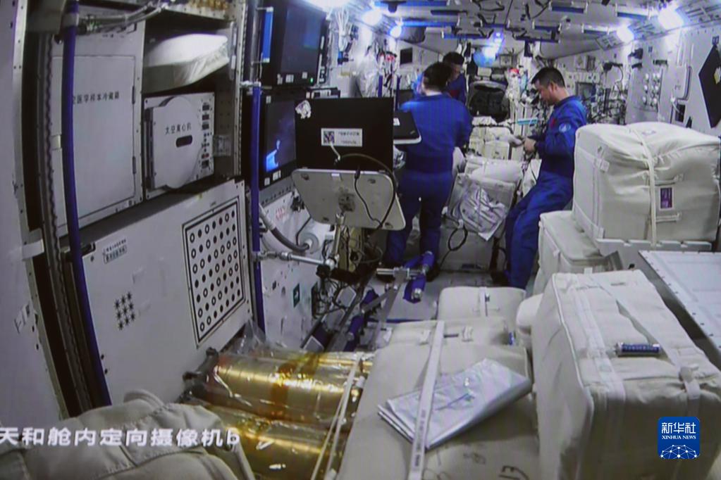 11月12日,在北京航天飞行控制中心拍摄的天舟五号货运飞船与空间站组合体完成自主快速交会对接后天和核心舱内的情况。新华社发(孙丰晓 摄)