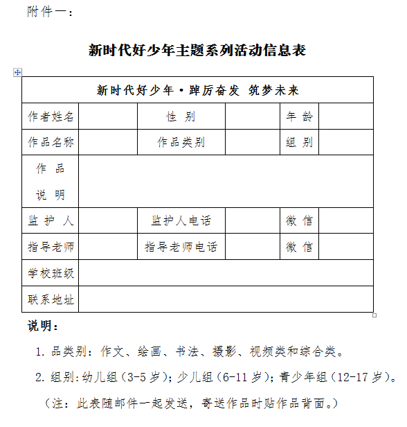(一)每幅投稿作品附100字以内创作说明(word文档),注明作者姓名、学校班级、指导老师、家长联系方式,另需要附个人简介一份和照片一张(电子版);