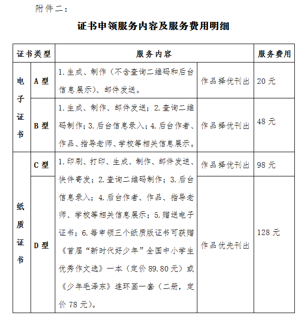 (四)所公布的优秀作品名单中的作者、表演者、指导老师或单位,均可申领电子证书或纸质证书,申领服务内容和服务费用(指导老师等同)明细具体见附件二。