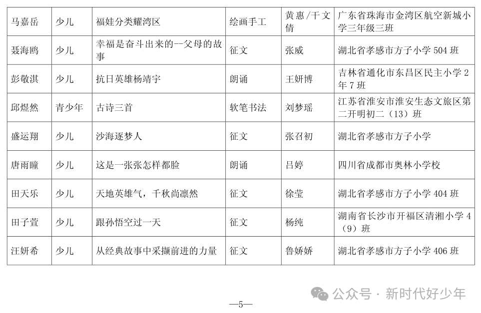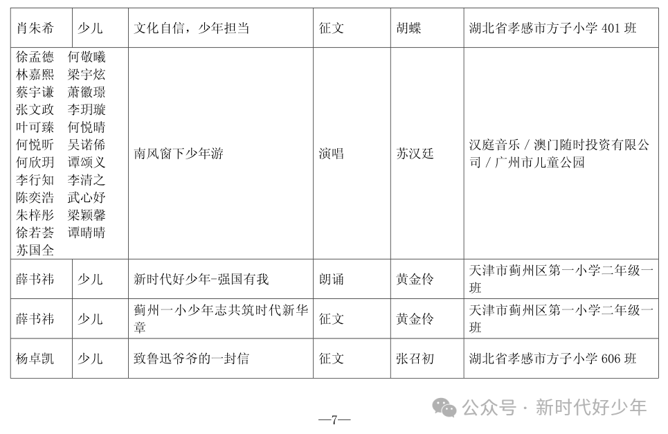 经过对投稿作品认真审核筛选,现将“新时代好少年·致敬新时代 争做好少年”主题教育活动优秀作品名单(第六批)公布如下: