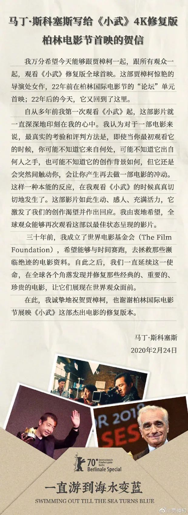 2月25日,贾樟柯在个人微博发布了斯科塞斯写给 《小武》4K修复版柏林电影节首映的贺信。信中,斯科塞斯表达了自己对《小武》的偏爱,也深切呼吁经典电影资料修复的价值,全文如下: