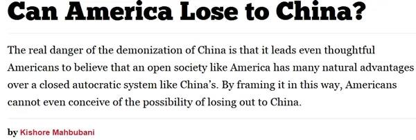 在心理上连想想输给中国的勇气都没有,这说明美国人还是严重低估了中国的挑战。西方列强和日本入侵给中国带来百年国耻,这是中国历史上最惨痛一页,中国人认为美国的攻击是西方强权想压制中国,阻碍中国登上世界舞台的最后企图。美国政策界最大的错误很简单,他们认为美国的战略对手只是中共,这暗含了美国民主制必然胜利的信心。但是,年轻的美国面临的真正对手,是一个有四千年历史的文明。作为美国的朋友,我只能欣慰地说,这种幼稚的战略只能以破产告终。