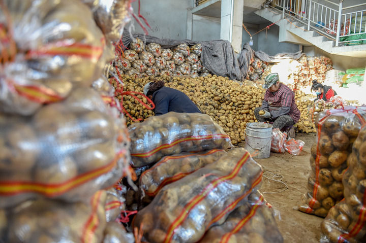 11月11日,在通辽运达绿色农副产品批发市场,工作人员在分拣土豆。新华社记者 连振 摄
