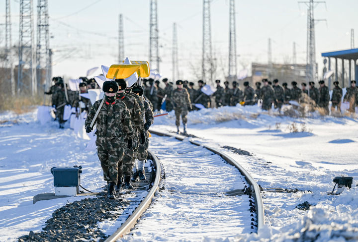 11月11日,在中铁沈阳局集团有限公司通辽站南编组场,武警官兵在清理积雪。新华社记者连振摄