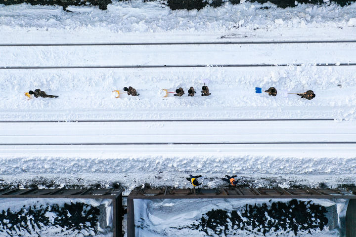 11月11日,在中铁沈阳局集团有限公司通辽站南编组场,武警官兵和铁路工作人员清理积雪(无人机照片)。新华社记者 连振 摄
