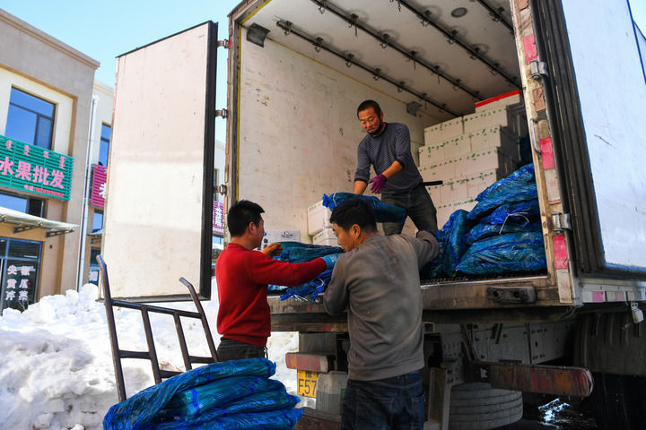 11月11日,在通辽运达绿色农副产品批发市场,工作人员在搬运蔬菜。新华社记者 刘磊 摄