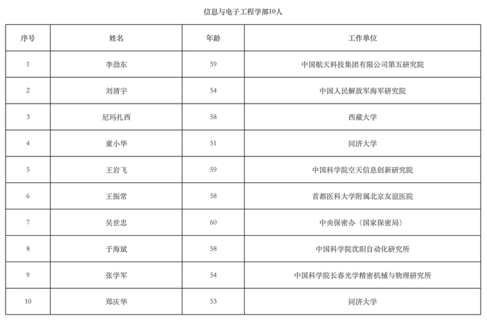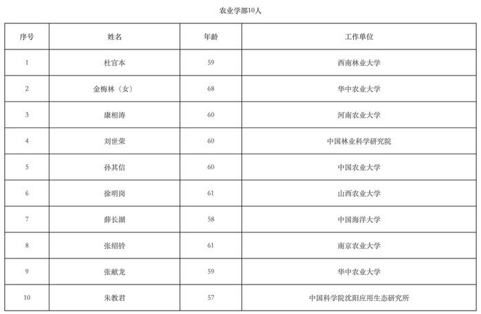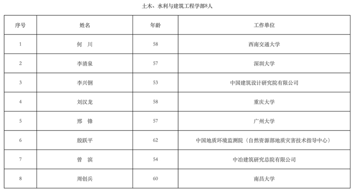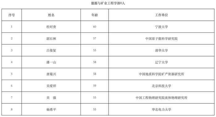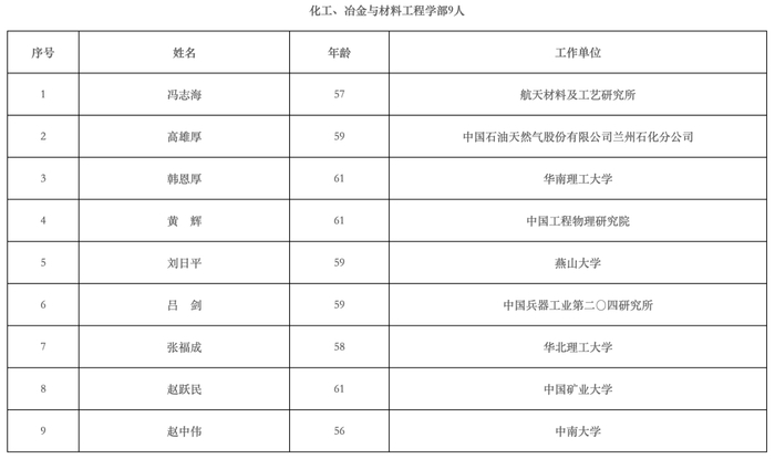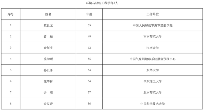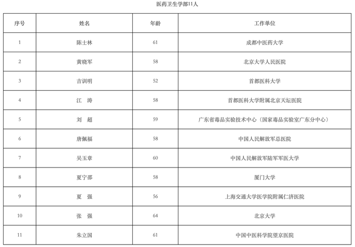 在新当选院士中,数学物理学部10人,化学部10人,生命科学和医学学部11人,地学部8人,信息技术科学部8人,技术科学部12人。新当选院士平均年龄54.7岁,最小年龄45岁,最大年龄65岁,60岁(含)以下的占90%。院士队伍的学科分布和年龄结构进一步优化。