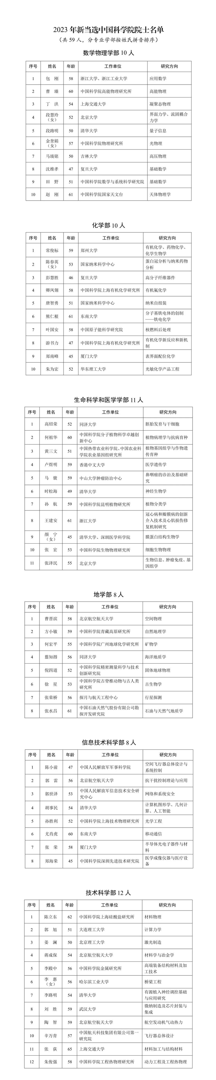 强国之路.科技频道 北京讯(通讯员 周晓辉):11 月 22 日,中国科学院、中国工程院官网公布了2023年院士增选当选院士名单。其中,中国科学院新增59位院士,中国工程院新增74位院士。