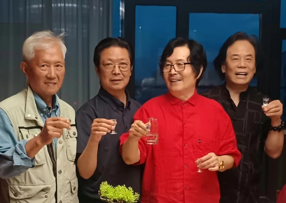 左起:赵文元、方军、贺成、忆君共同举杯祝贺大展圆满成功。