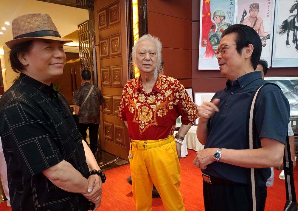 方军、忆君、孔可立三位书画家在展览大厅相遇,并亲切交谈。